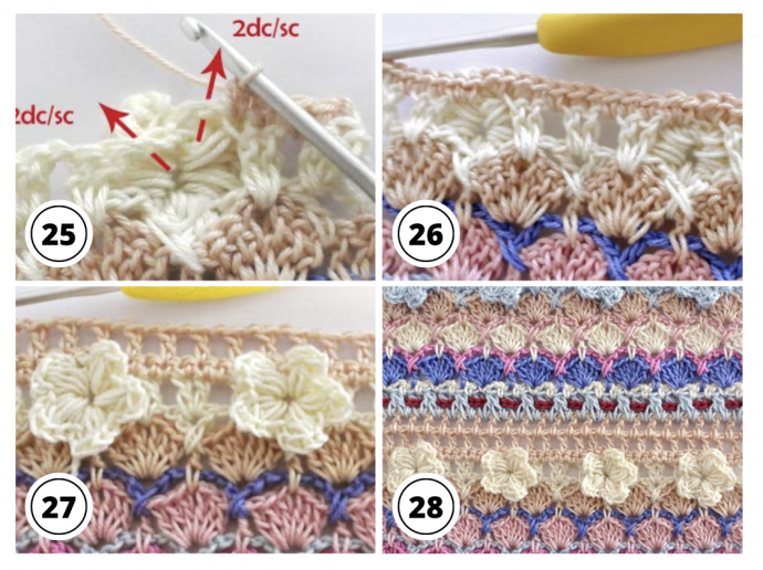 Make 2ch and 1dc/sc in second tr/dc below. Then work 1dc/sc in space of 1ch, 1dc/sc in each of next tr/dc, 2dc/sc in space of 1ch before flower and 2dc/sc in space of 1ch after flower. Continue work in this manner until you get end of row. Work 1dc/sc in third ch and turn.