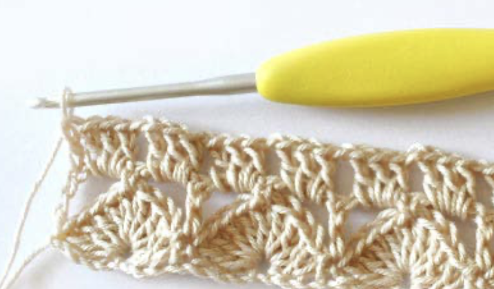 Row 4: make 1ch and 1dc/sc in first tr/dc, * work shell in next 1ch (between tr/dc), make 1dc/sc in space of 1ch; rep from *, work shell in next 1ch, make 1dc/sc in third ch, turn.