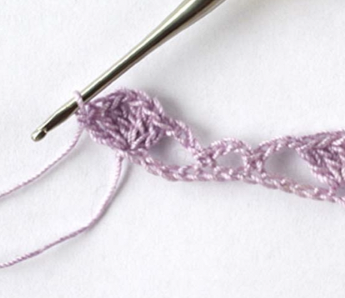 shell in shell, 3 ch, 1 dc/sc in space of 3 ch, 3 ch, 1 dc/sc in next space of 3 ch, 3 ch, shell in shell, 1 tr/dc in first ch of previous row. Turn.