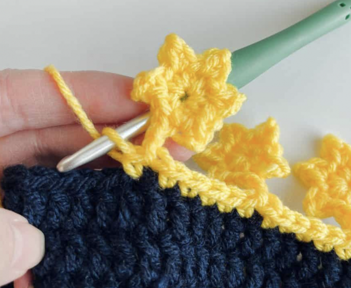 - Once you have added stars to all sides of your project, work single crochet stitches in the last four stitches.