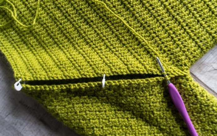 Body Border: Looking at “right side” attach in corner point as pictured. Ch-1, sc evenly down row ends and back up to their raglan point.