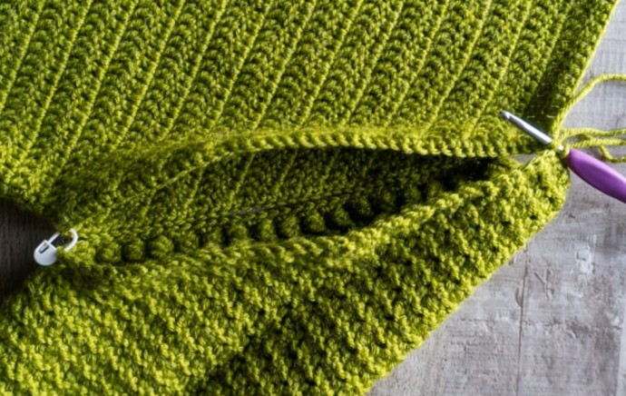 Sleeves border: Looking at “right side” attach in top corner as pictured. Ch-1, sc evenly down row ends and around to other top corner.