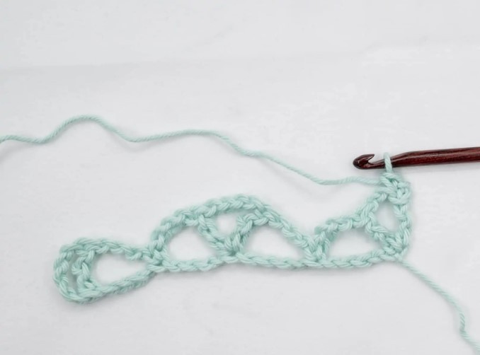 Row 1: Tr 1 6th ch from hook, *ch 3, sk 4 st, sc 1 in next st, ch 3, sk 4 st**, tr 1 in next st, ch 5, tr 1 in same st as last tr*, repeat from *to* until you have 1 stitch left, ending last repeat at **, tr 1 in last st, ch 2, tr in same st as last tr, turn.