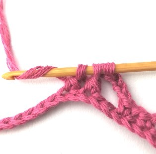6. Chain four. Next you will make a double crochet two together (dc2tog) working in the third and in the fifth stitch.