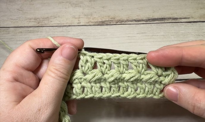 Row Two: Hdc2tog over the 1st 2 sts, *sl st in the next st, hdc2tog beginning in the same st as the last sl st; Rpt from * across to the final st and turning ch, end with a sl st in the next st, hdc2tog in the same st as the previous sl st and top of the turning ch. Ch 3 (Counts as a dc), turn.