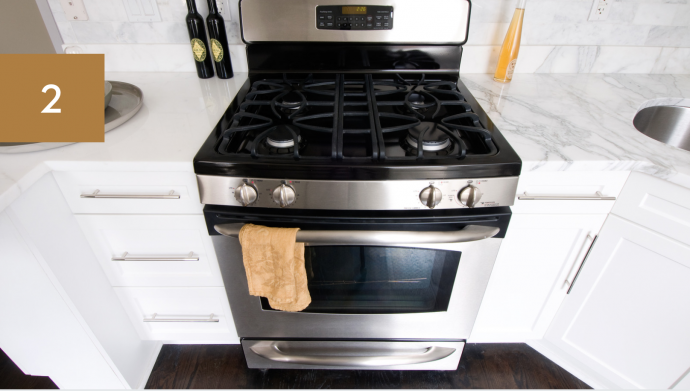 Fill up an oven-safe pan with water, and add the juice of two lemons and the lemon halves too. Then pop the pan in the oven and turn it on. Wait until the water boils before you take the pan out. The steam will loosen the grime and grease inside your oven and will help you remove it more easily. Let the oven cool down before wiping it down with a damp cloth.