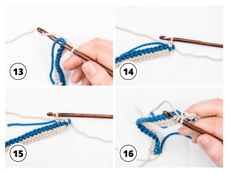 Row 5 with CA: Attach yarn on RS with sc in 1st st, *BLsc 1 in next st, Ldc in FL of st 2 rows below, BLsc 1 in next st, Ldc in FL of st 2 rows below, BLsc 1 in next st*, repeat from *to* until you have 1 st left, sc in last st, fasten of & cut yarn.