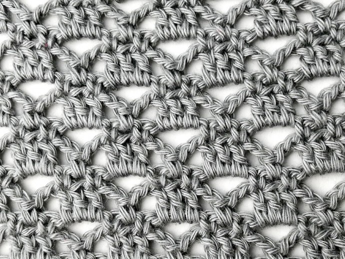 The Lacy Pyramid Stitch is a repeat of four rows. The fabric turns out lacy and light.